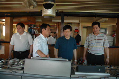 2007年7月26日下午,寧波市交通局黨工委副書記、副局長(zhǎng)勞可軍等一行四人,在公司總經(jīng)理管雄文以及集團(tuán)公司領(lǐng)導(dǎo)蔣宏生、費(fèi)曉鳴等的陪同下,來(lái)到??吭诒眮龆谡谛敦涀鳂I(yè)的“金色大地”輪,親切慰問(wèn)奮戰(zhàn)在高溫第一線的船員。