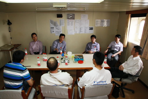 公司領(lǐng)導(dǎo)先后檢查了“寧波先鋒”輪船體結(jié)構(gòu)、駕駛臺、主甲板、機艙、生活區(qū)等設(shè)備設(shè)施,詳細了解船舶營運和船員思想生活情況,并與船長、輪機長、大副等主要高級船員進行座談,共同探討存在的問題和解決方案。