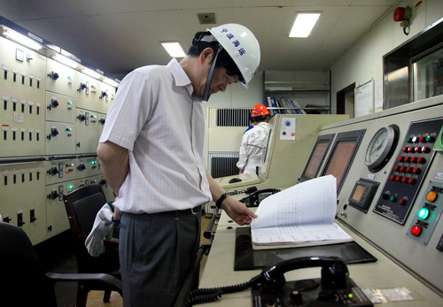 公司領導一行在船長、輪機長等陪同下來到機艙,對機器處所、集控室、備品備件間、車床間,以及駕駛臺、船員生活場所等進行了仔細檢查,詢問前期各類安全檢查中發(fā)現(xiàn)問題的整改情況、查閱有關安全記錄、了解關鍵設備的操作要求。