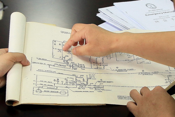 0950,船長報(bào)告:“主機(jī)出現(xiàn)燃油低壓報(bào)警,主機(jī)轉(zhuǎn)速自動降至50rpm,更換備用組濾器后,雖恢復(fù)正常轉(zhuǎn)速,隨后又發(fā)生主機(jī)燃油低速報(bào)警并自動降速直至熄火停車,船舶處于失控狀態(tài),現(xiàn)已啟動主機(jī)故障應(yīng)急程序?!惫玖⒓唇M織專家進(jìn)行原因分析——可能是由于燃油日用柜內(nèi)油太臟,大風(fēng)浪船舶搖擺致使底腳油翻起引起濾器堵塞?!傲⒓雌饎觽溆冒l(fā)電機(jī)組并車供電,待備用機(jī)組并車后重油機(jī)組換用輕油,確保船舶電力供應(yīng)”、“盡快恢復(fù)一組燃油濾器,然后主機(jī)換用輕油起動,并保持較低負(fù)荷運(yùn)行”、“對日用柜燃油進(jìn)行循環(huán)分離、提高燃油分離溫度、減少分離量至正常值并縮短排渣時間”……,一道道指示,飛越長空指導(dǎo)著船舶。同時,考慮到天氣影響和可能的后果,公司又于中國海上搜救中心、臺灣中華搜救中心取得聯(lián)系,請求做好隨時施救準(zhǔn)備。