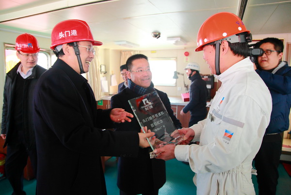 “明州62”輪成功靠泊頭門港口一期碼頭一號(hào)泊位后,臺(tái)州市委常委、臨海市委書記柯昕野等領(lǐng)導(dǎo)登上“明州62”輪,與一線船員親切交談,向全體全員表示慰問和祝賀,向船舶贈(zèng)送了頭門港開港通航首船紀(jì)念獎(jiǎng)杯,并參觀了船舶。