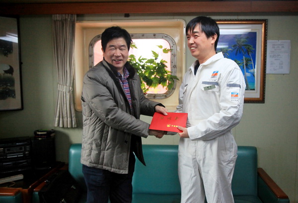 2015年1月28日上午,公司領導褚敏、董軍、徐海良在相關部門負責人陪同下前往靠泊在北侖電廠卸貨作業(yè)的“明州20”輪檢查指導工作,并向全體船員送去節(jié)日問候和祝福。