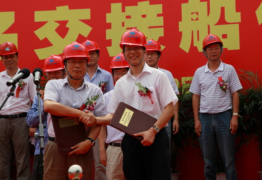 董總與中海工業(yè)(江蘇)有限公司副總經(jīng)理汪毅陵互換交接船證書。隨后,蔣海良副總經(jīng)理接受了中海工業(yè)(江蘇)有限公司副總鄭波贈送的船模。